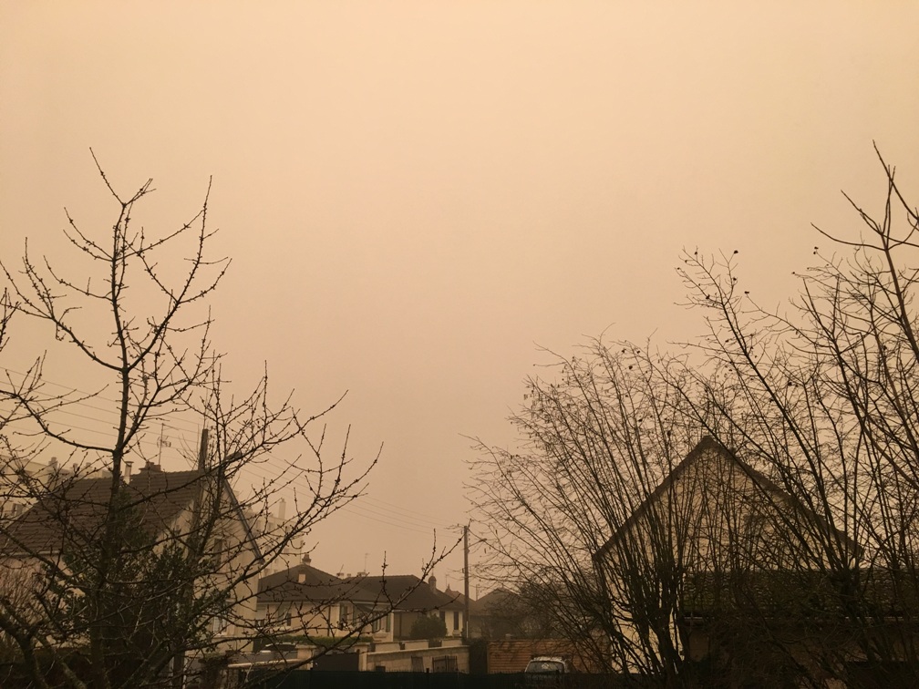 Le ciel est couleur de nuit apocalyptique sur Dijon ce matin, le soleil invisible, le jaune est partout, c'est impressionnant quelqu'un a une explication scientifique ?
